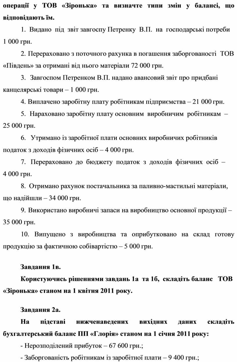 операції у ТОВ «Зіронька» та визначте типи змін у балансі, що відповідають їм.