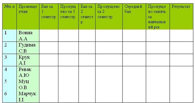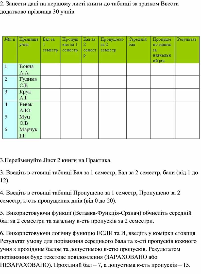 2. Занести дані на першому листі книги до таблиці за зразком Ввести додатково прізвища 30 учнів