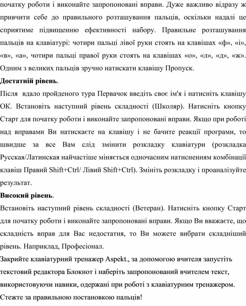 Закрийте клавіатурний тренажер Aspekt., за допомогою вчителя запустіть текстовий редактора Блокнот і наберіть запропонований вчителем текст, використовуючи навики, одержані при роботі з клавіатурним тренажером. Стежте за правильною постановкою пальців!