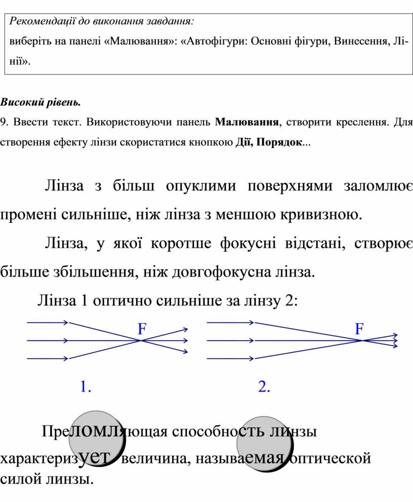 9. Ввести текст. Використовуючи панель Малювання, створити креслення. Для створення ефекту лінзи скористатися кнопкою Дії, Порядок...