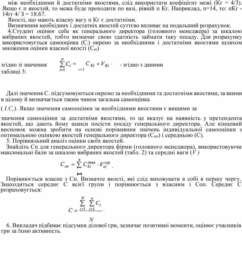 4. Студент оцінює себе як генерального директора (головного менеджера) за шкалою вибраних якостей, тобто визначає свою здатність займати таку посаду. Для розрахунку використовується самооцінка (С;) окремо за необхідними і достатніми якостями шляхом множення оцінки власної якості (Сю)