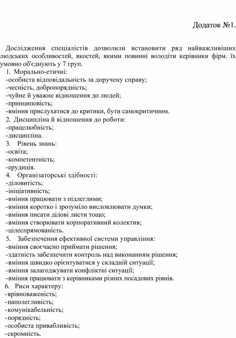 Дослідження спеціалістів дозволили встановити ряд найважливіших людських особливостей, якостей, якими повинні володіти керівники фірм. їх умовно об'єднують у 7 груп.