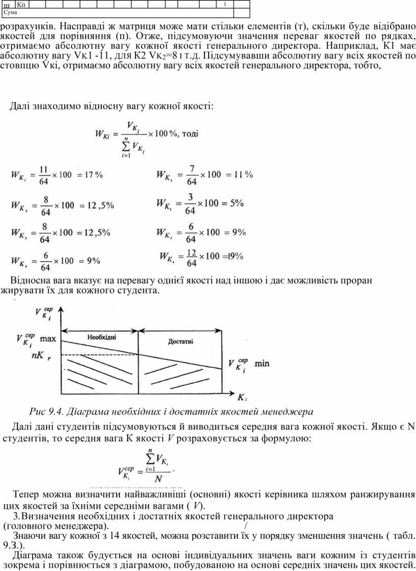 На осі абсцис розміщуються якості, кількість на осі ординат-ваги якостей (табл.9.3.). Мета роботи - виділити ті якості (достатні), без яких претендент не може займати посаду генерального директора (головного менеджера) ні за яких умов. Для того, щоб знайти межу між необхідними й достатніми якостями, слід використати коефіцієнт межі (Кг = 4/3). Якщо є п якостей, то межа буде проходити по вазі, рівній п Кг. Наприклад, п=14, то: пКг - 14гг 4/ З = 18.67.