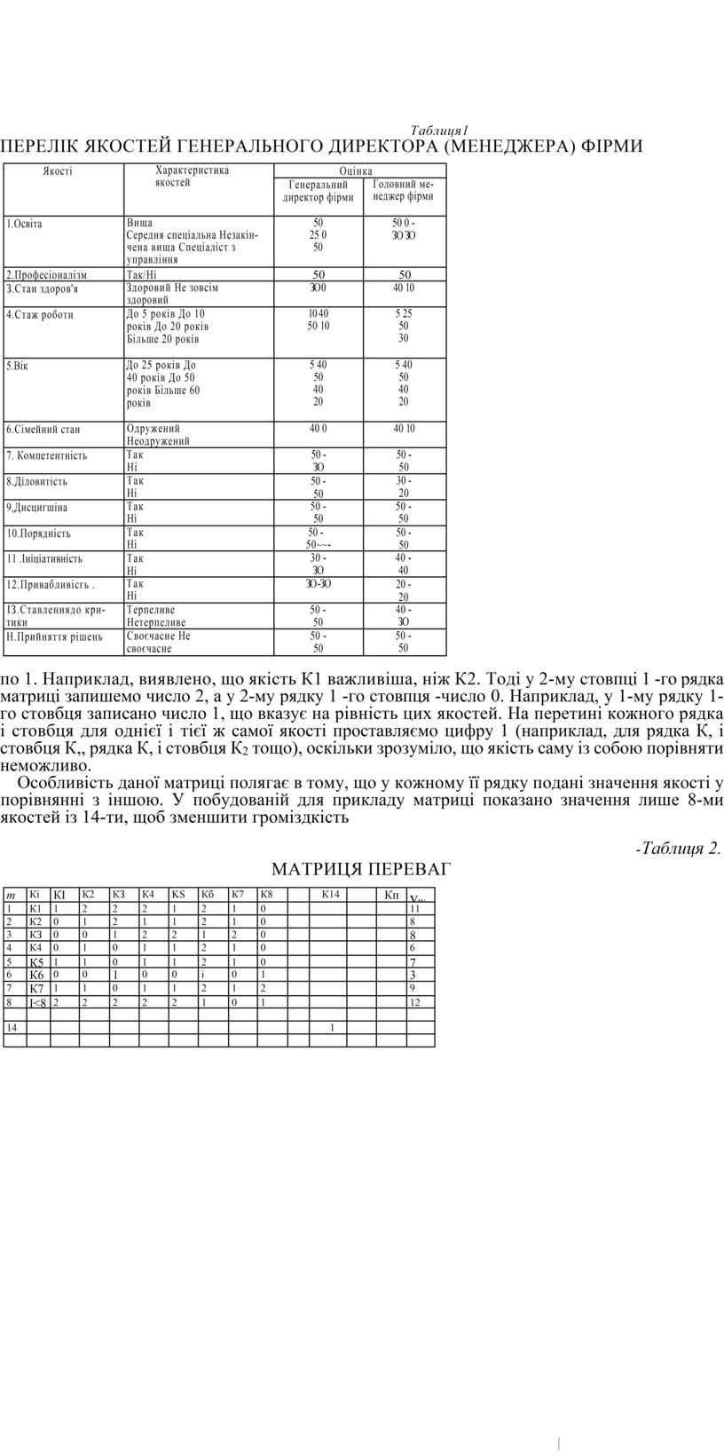 матриці, Кі – якість генерального директора, п- кількість якостей, Vкi- абсолютна вага якостей.
