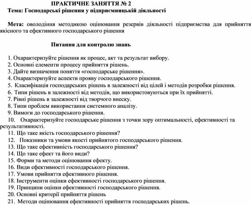Мета: оволодіння методикою оцінювання резервів діяльності підприємства для прийняття якісного та ефективного господарського рішення
