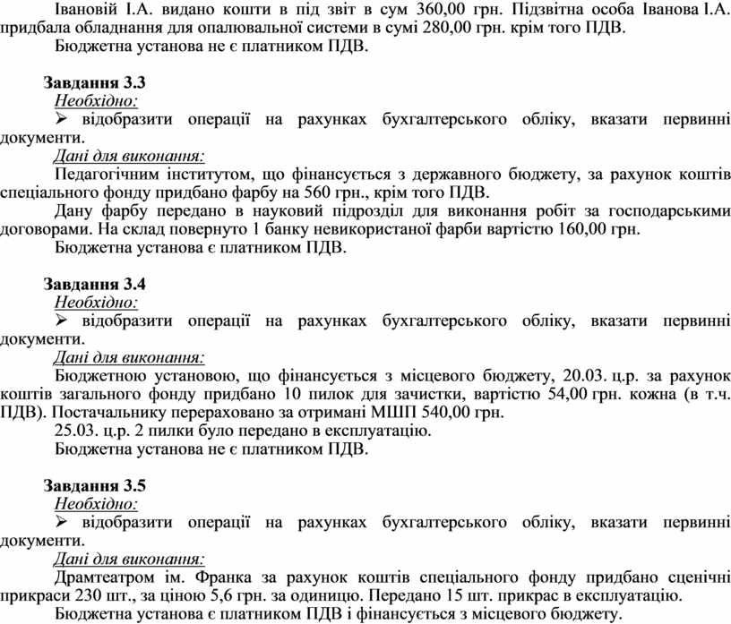 Івановій І.А. видано кошти в під звіт в сум 360,00 грн. Підзвітна особа Іванова І.А. придбала обладнання для опалювальної системи в сумі 280,00 грн. крім того ПДВ.