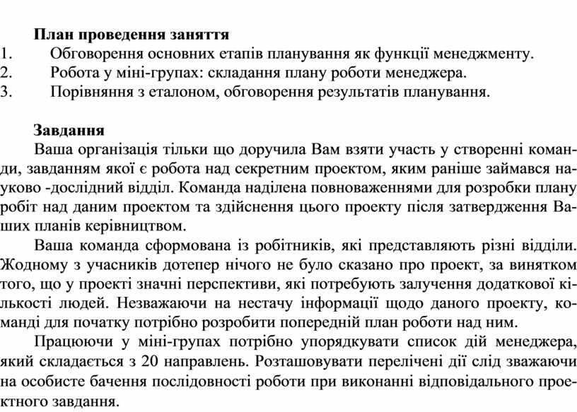 Працюючи у міні-групах потрібно упорядкувати список дій менеджера, який складається з 20 направлень. Розташовувати перелічені дії слід зважаючи на особисте бачення послідовності роботи при виконанні відповідального прое-ктного завдання.