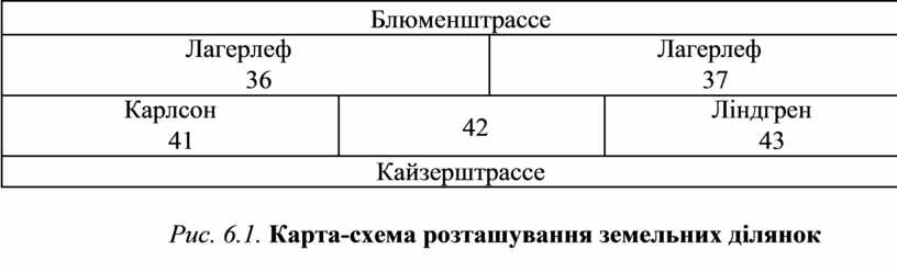 2. Студенти поділяються на 6 міні- груп. Три представляють сім’ю Карлсо-нів, інші 3 – сім’ю Ліндгренів. Кожній групі роздається конфіденційна інфор-мація про сім’ю та їхні плани стосовно земельної ділянки № 42. Кожна міні-група обирає представника для ведення переговорів стосовно купівлі-продажу земельної ділянки № 42. Переговори проходять у письмовій формі. Після здійс-нення акту купівлі-продажу, група фіксує результати і представника, що пер-шим назвав ціну, на якій закінчився торг. За результатами гри обирається 2 пе-реможця: одна міні-група сім’ї Карлсонів і одна – Ліндгренів, що здійснили для себе найвигіднішу купівлю (продаж) земельної ділянки № 42. Карта-схема роз-ташування земельних ділянок наведена на рис. 6.1.