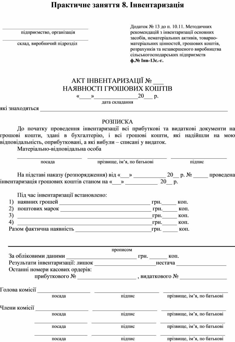 Додаток № 13 до п. 10.11. Методичних рекомендацій з інвентаризації основних засобів, нематеріальних активів, товарно-матеріальних цінностей, грошових коштів, розрахунків та незавершеного виробництва сільськогосподарських підприємств ф.№ Інв-13с.-г. |