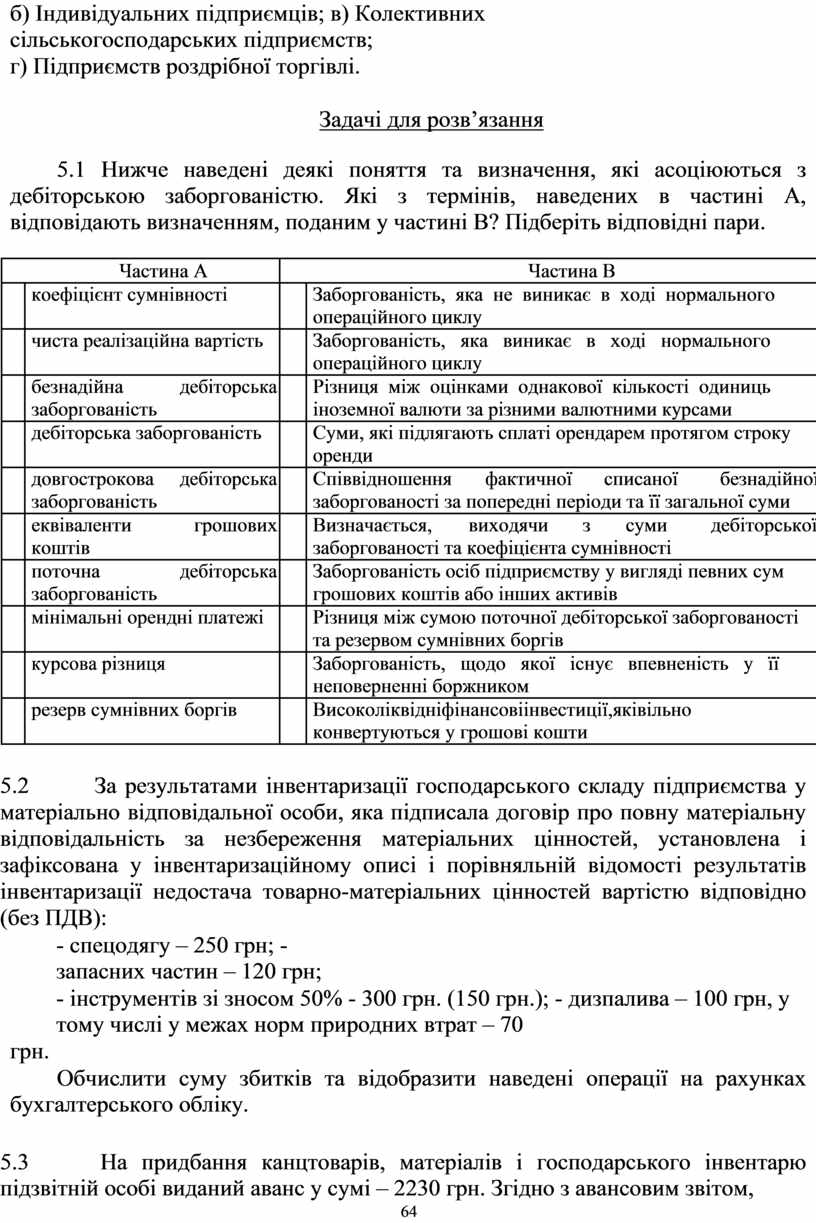 5.1 Нижче наведені деякі поняття та визначення, які асоціюються з дебіторською заборгованістю. Які з термінів, наведених в частині А, відповідають визначенням, поданим у частині В? Підберіть відповідні пари.