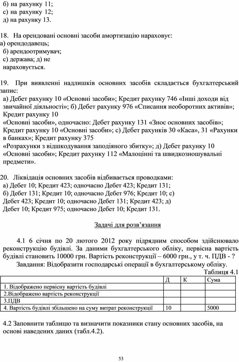 4.1 6 січня по 20 лютого 2012 року підрядним способом здійснювало реконструкцію будівлі. За даними бухгалтерського обліку, первісна вартість будівлі становить 10000 грн. Вартість реконструкції – 6000 грн., у т. ч. ПДВ - ?