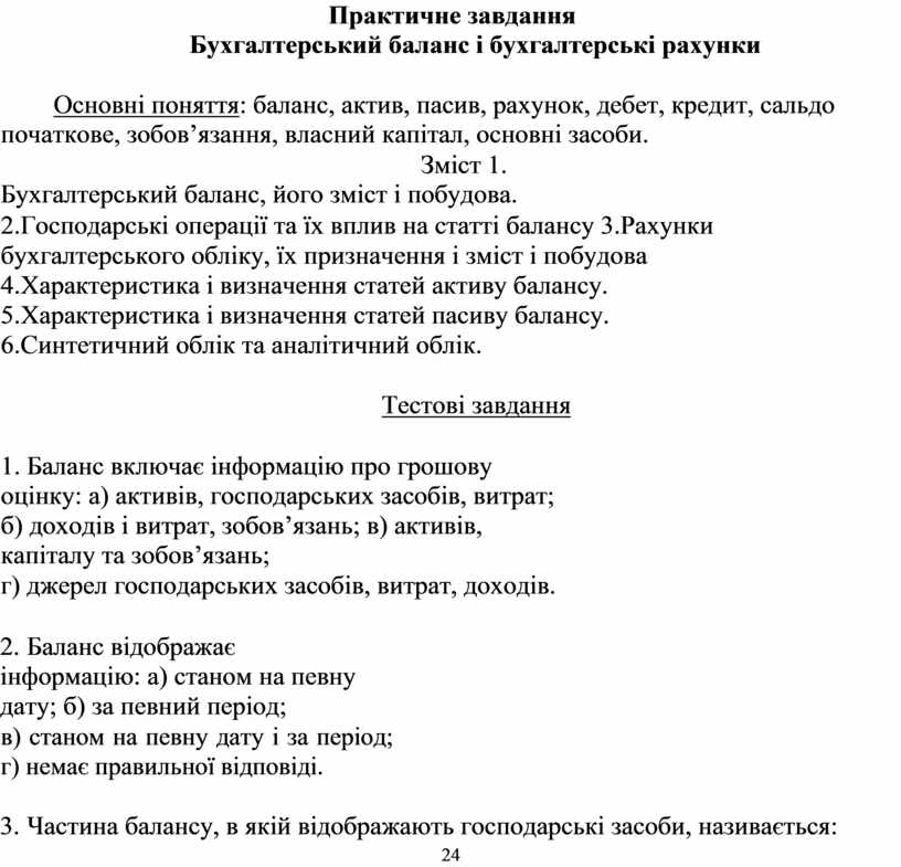 Основні поняття: баланс, актив, пасив, рахунок, дебет, кредит, сальдо початкове, зобов’язання, власний капітал, основні засоби.