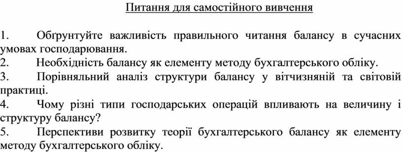2.Господарські операції та їх вплив на статті балансу 3.Рахунки бухгалтерського обліку, їх призначення і зміст і побудова 4.Характеристика і визначення статей активу балансу. 5.Характеристика і визначення статей пасиву балансу. 6.Синтетичний облік та аналітичний облік.