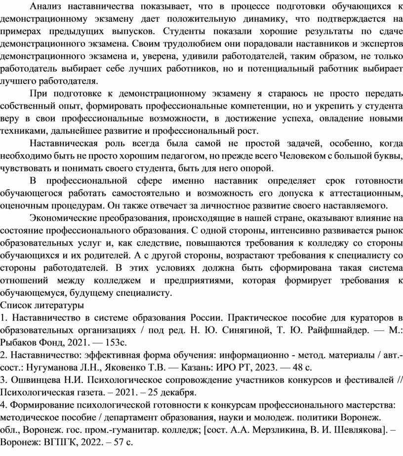Анализ наставничества показывает, что в процессе подготовки обучающихся к демонстрационному экзамену дает положительную динамику, что подтверждается на примерах предыдущих выпусков. Студенты показали хорошие результаты по сдаче демонстрационного экзамена. Своим трудолюбием они порадовали наставников и экспертов демонстрационного экзамена и, уверена, удивили работодателей, таким образом, не только работодатель выбирает себе лучших работников, но и потенциальный работник выбирает лучшего работодателя.
