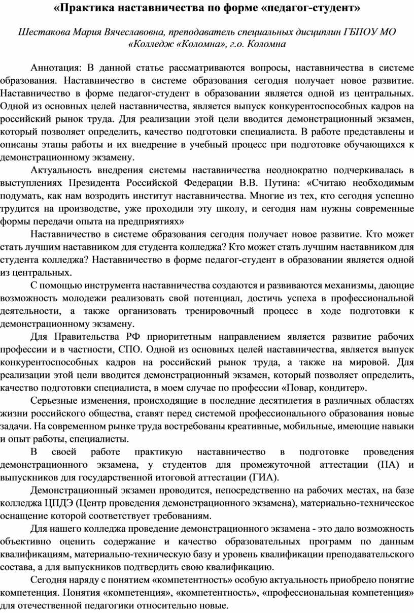 Аннотация: В данной статье рассматриваются вопросы, наставничества в системе образования. Наставничество в системе образования сегодня получает новое развитие. Наставничество в форме педагог-студент в образовании является одной из центральных. Одной из основных целей наставничества, является выпуск конкурентоспособных кадров на российский рынок труда. Для реализации этой цели вводится демонстрационный экзамен, который позволяет определить, качество подготовки специалиста. В работе представлены и описаны этапы работы и их внедрение в учебный процесс при подготовке обучающихся к демонстрационному экзамену.