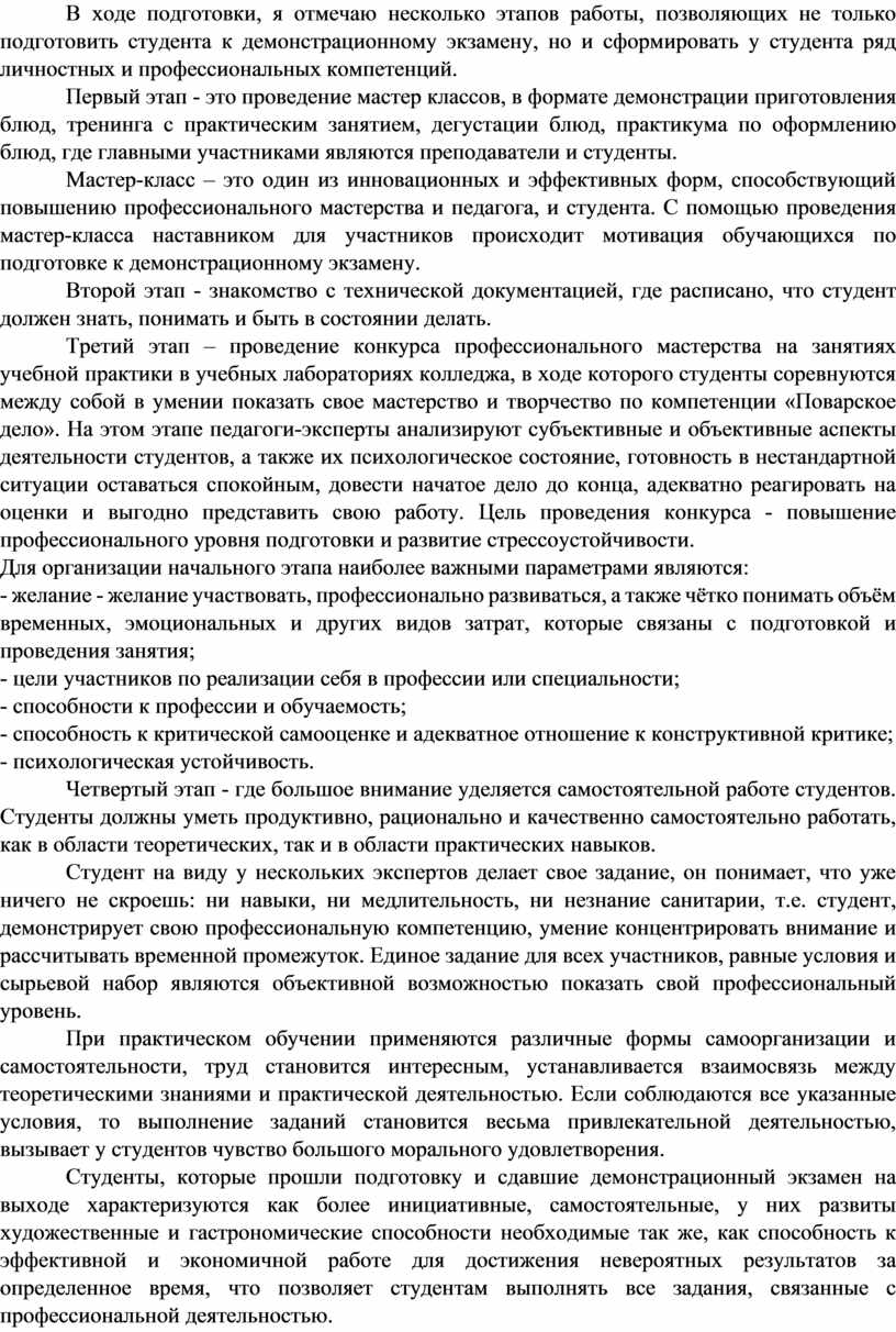 В ходе подготовки, я отмечаю несколько этапов работы, позволяющих не только подготовить студента к демонстрационному экзамену, но и сформировать у студента ряд личностных и профессиональных компетенций.