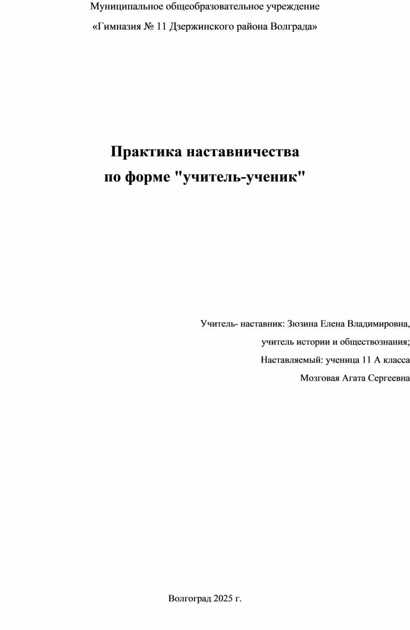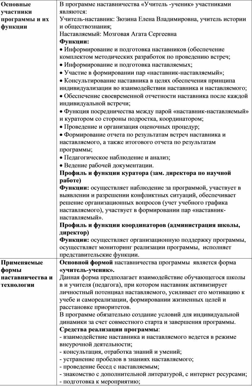 В программе наставничества «Учитель -ученик» участниками являются: Учитель-наставник: Зюзина Елена Владимировна, учитель истории и обществознания; Наставляемый: Мозговая Агата Сергеевна Функции: |