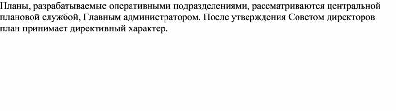 Планы, разрабатываемые оперативными подразделениями, рассматриваются центральной плановой службой, Главным администратором. После утверждения Советом директоров план принимает директивный характер.