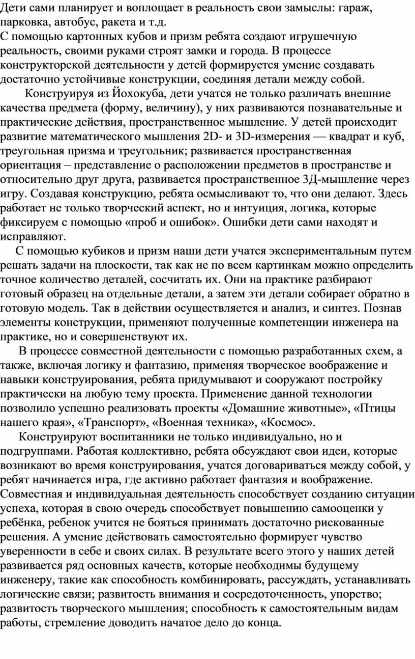 Конструируя из Йохокуба, дети учатся не только различать внешние качества предмета (форму, величину), у них развиваются познавательные и практические действия, пространственное мышление. У детей происходит развитие математического мышления 2D- и 3D-измерения — квадрат и куб, треугольная призма и треугольник; развивается пространственная ориентация – представление о расположении предметов в пространстве и относительно друг друга, развивается пространственное 3Д-мышление через игру. Создавая конструкцию, ребята осмысливают то, что они делают. Здесь работает не только творческий аспект, но и интуиция, логика, которые фиксируем с помощью «проб и ошибок». Ошибки дети сами находят и исправляют.