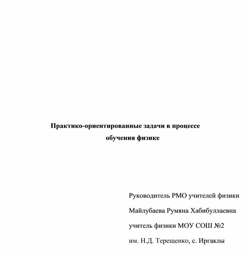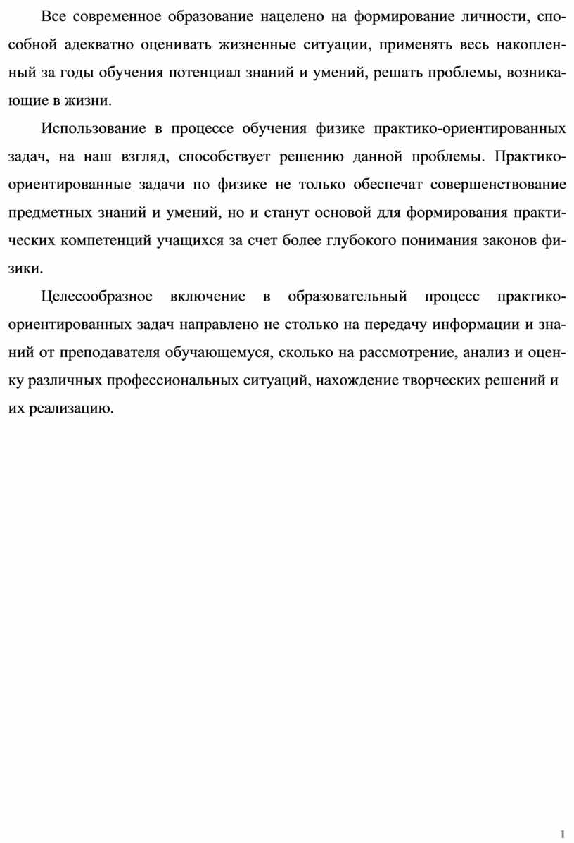 Использование в процессе обучения физике практико-ориентированных задач, на наш взгляд, способствует решению данной проблемы. Практико- ориентированные задачи по физике не только обеспечат совершенствование предметных знаний и умений, но и станут основой для формирования практи- ческих компетенций учащихся за счет более глубокого понимания законов фи- зики.
