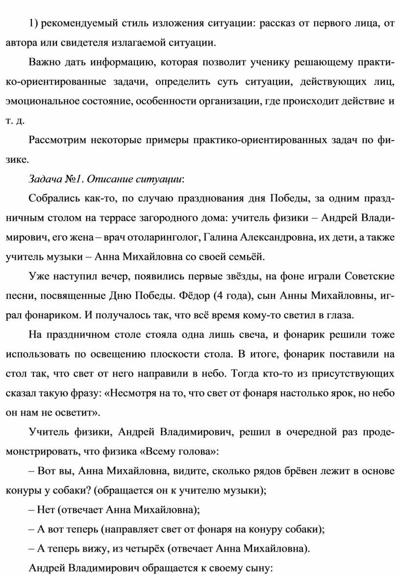 Важно дать информацию, которая позволит ученику решающему практи- ко-ориентированные задачи, определить суть ситуации, действующих лиц, эмоциональное состояние, особенности организации, где происходит действие и т. д.