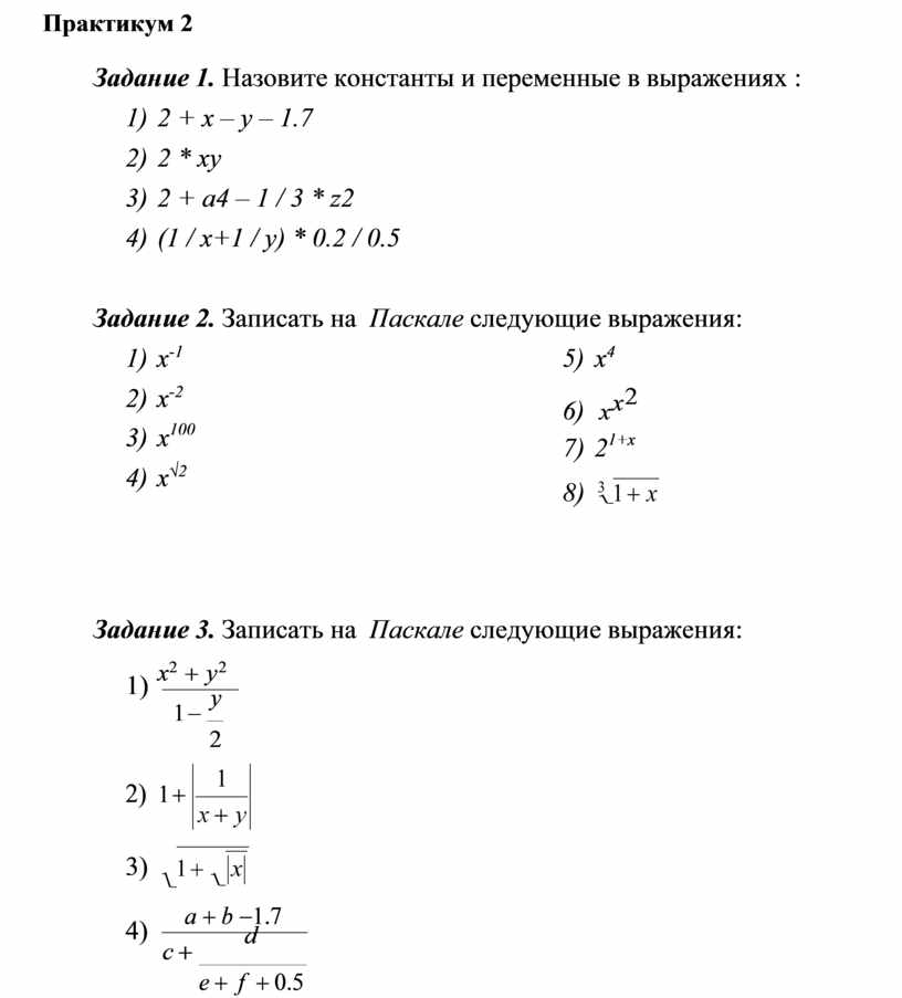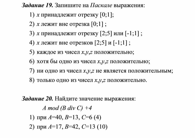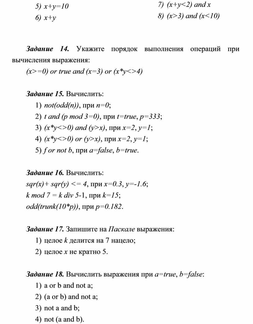 sqr(x)+ sqr(y) <= 4, при x=0.3, y=-1.6; k mod 7 = k div 5-1, при k=15; odd(trunk(10*p)), при p=0.182.