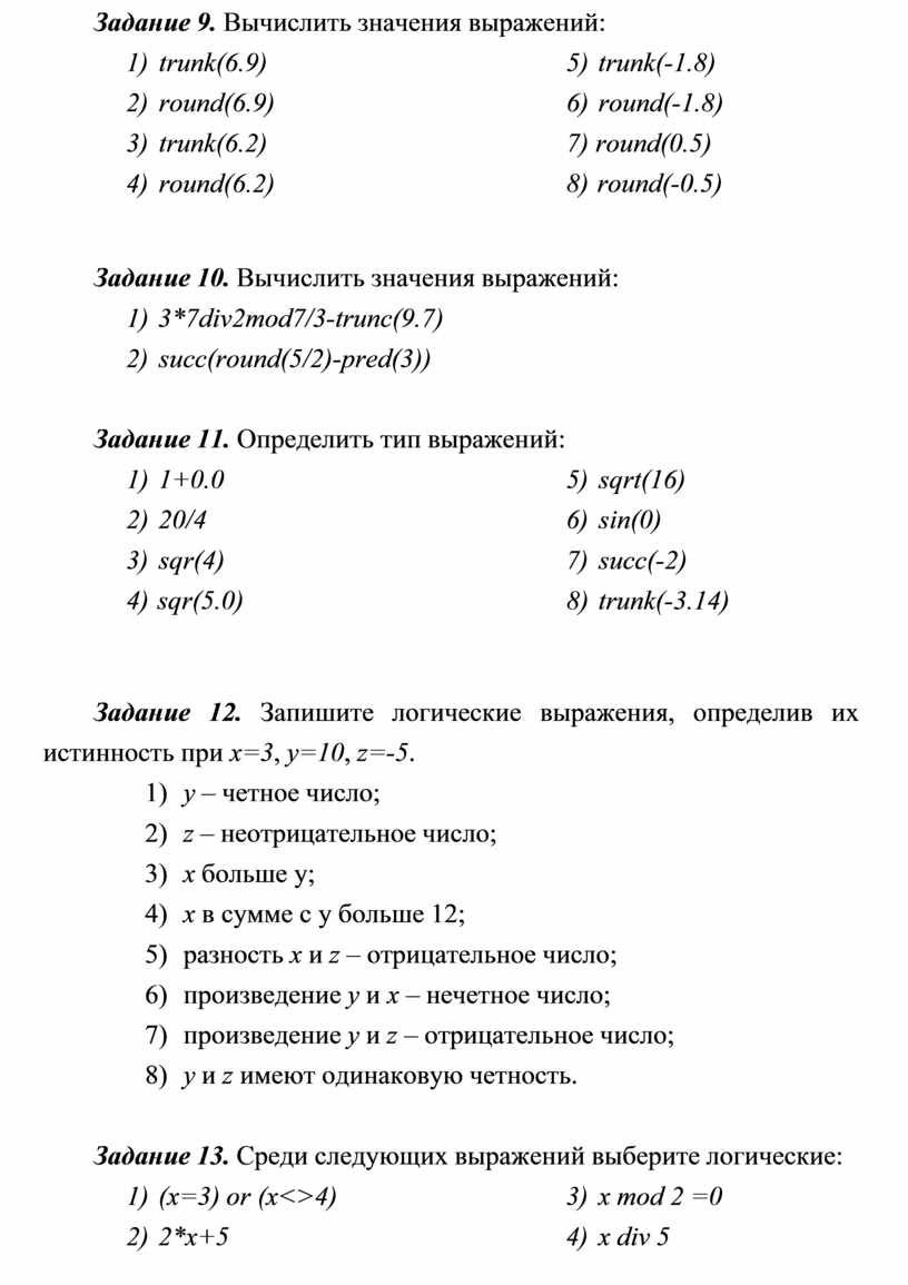 Задание 12. Запишите логические выражения, определив их истинность при x=3, y=10, z=-5.