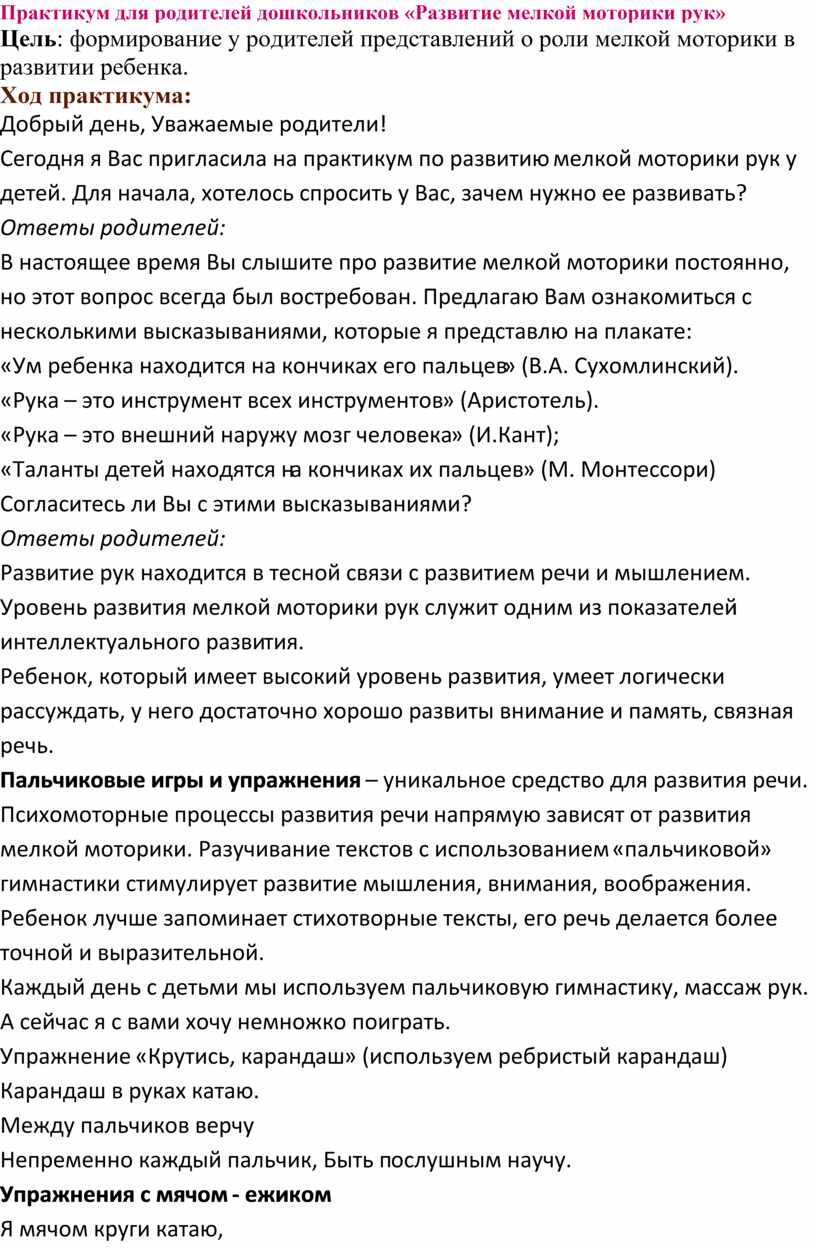 Практикум для родителей дошкольников «Развитие мелкой моторики рук»