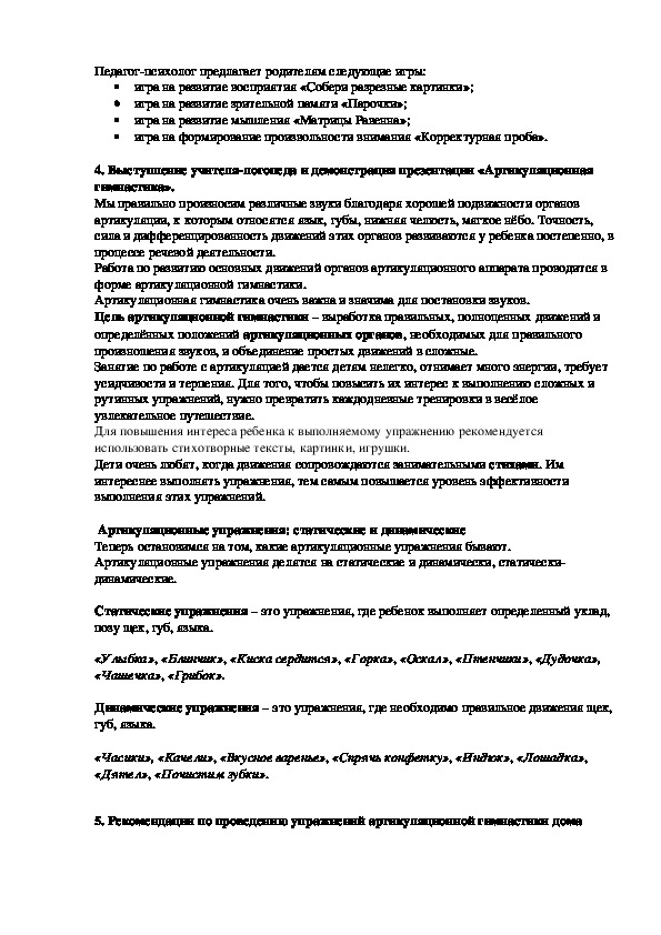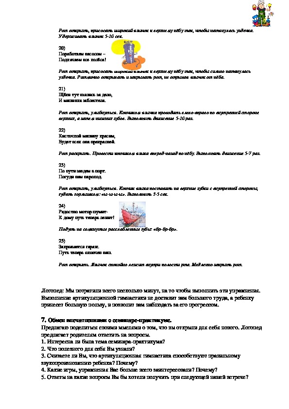 7. Дать рекомендации по выполнению артикуляционной гимнастики в домашних условиях;