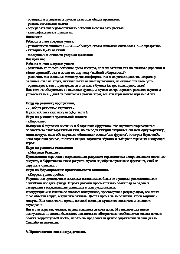 3. Практические задания родителям. Игры на развитие восприятия, зрительной памяти, мышления, на формирование произвольности внимания.