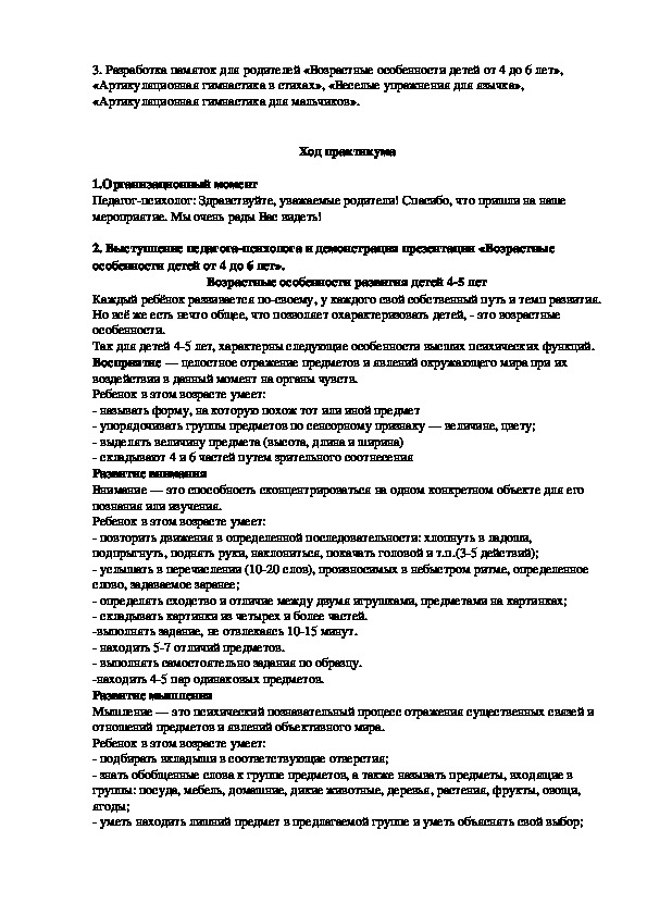 «Артикуляционная гимнастика».3. Разработка памяток для родителей «Возрастные особенности детей от 4 до 6 лет»,