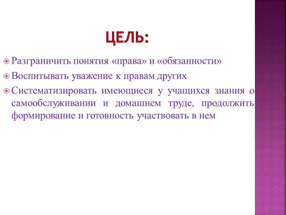 Систематизировать имеющиеся у учащихся знания о самообслуживании и домашнем труде, продолжить формирование и готовность участвовать в нем
