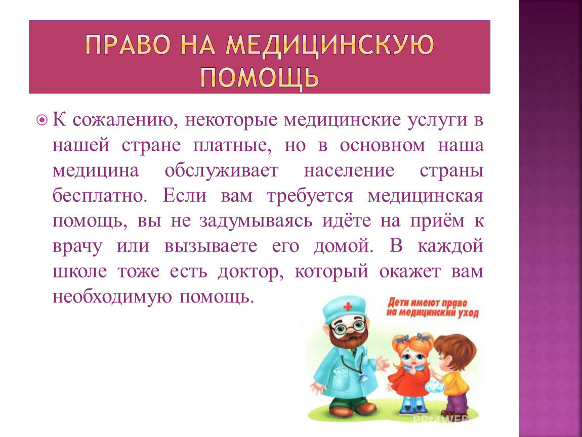 К сожалению, некоторые медицинские услуги в нашей стране платные, но в основном наша медицина обслуживает население страны бесплатно. Если вам требуется медицинская помощь, вы не задумываясь идёте на приём к врачу или вызываете его домой. В каждой школе тоже есть доктор, который окажет вам необходимую помощь.