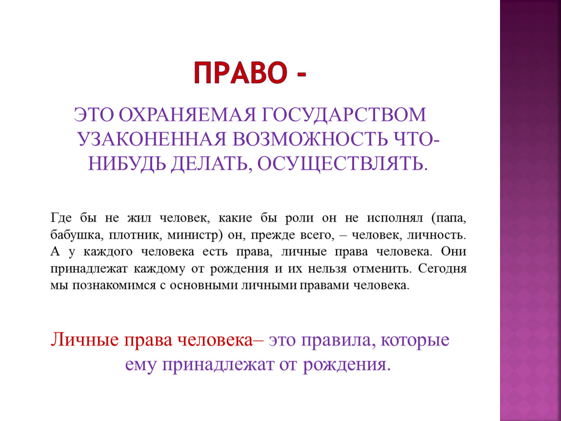 Где бы не жил человек, какие бы роли он не исполнял (папа, бабушка, плотник, министр) он, прежде всего, – человек, личность. А у каждого человека есть права, личные права человека. Они принадлежат каждому от рождения и их нельзя отменить. Сегодня мы познакомимся с основными личными правами человека.