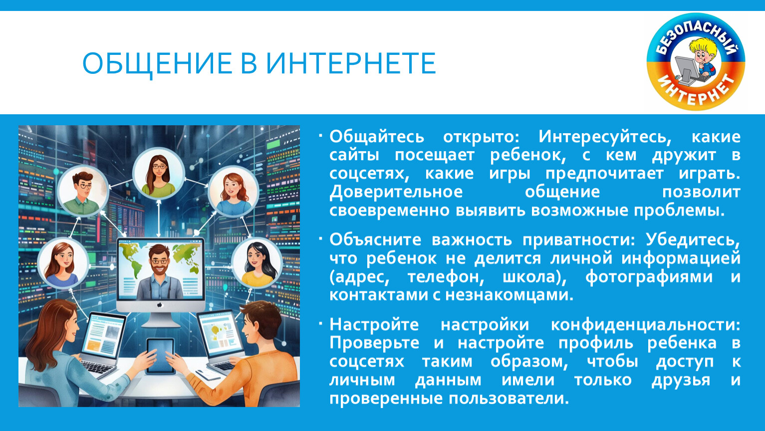 Общайтесь открыто: Интересуйтесь, какие сайты посещает ребенок, с кем дружит в соцсетях, какие игры предпочитает играть. Доверительное общение позволит своевременно выявить возможные проблемы.
