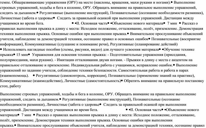 Упражнения для освоения техники прыжка: - Подготовительные упражнения (приседания, полуприседания, махи руками). - Имитация отталкивания двумя ногами. - Прыжки в длину с места с акцентом на правильное отталкивание и приземление. Индивидуальная работа с учащимися, исправление ошибок. |