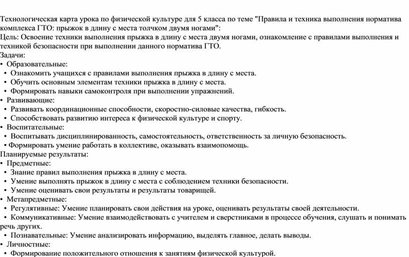 Технологическая карта урока по физической культуре для 5 класса по теме "Правила и техника выполнения норматива комплекса ГТО: прыжок в длину с места толчком двумя ногами":