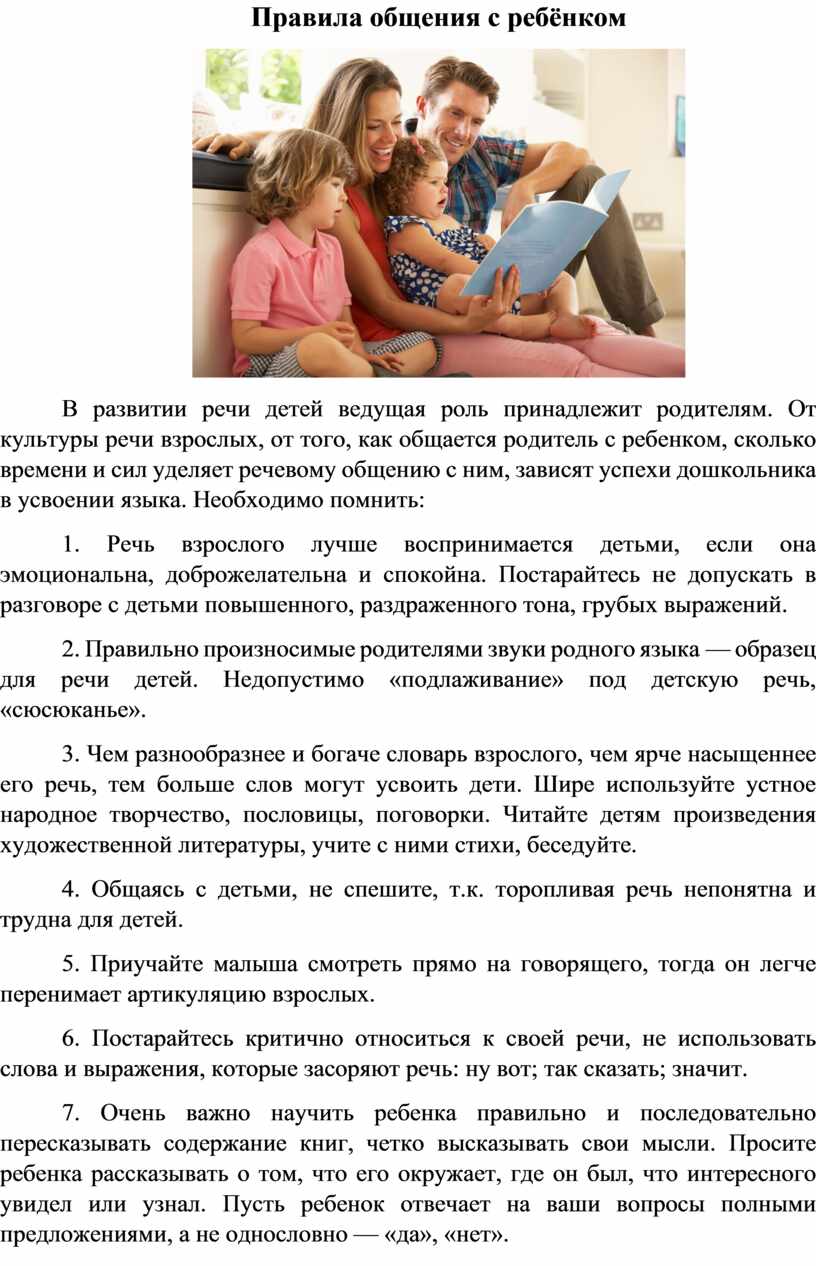 В развитии речи детей ведущая роль принадлежит родителям. От культуры речи взрослых, от того, как общается родитель с ребенком, сколько времени и сил уделяет речевому общению с ним, зависят успехи дошкольника в усвоении языка. Необходимо помнить: