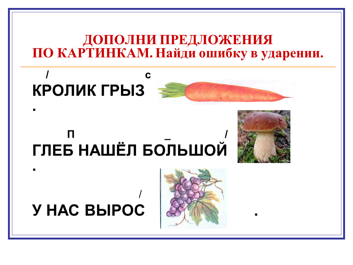 ДОПОЛНИ ПРЕДЛОЖЕНИЯ ПО КАРТИНКАМ. Найди ошибку в ударении.