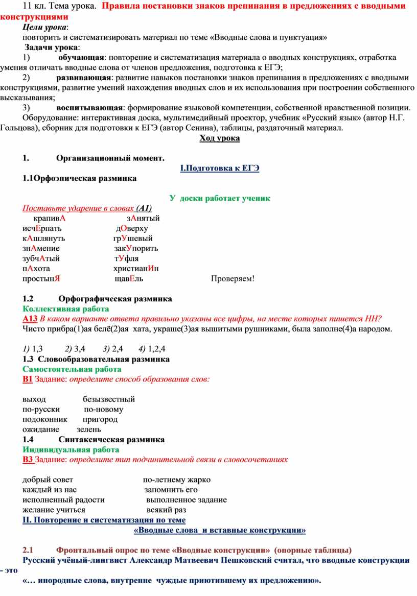 11 кл. Тема урока. Правила постановки знаков препинания в предложениях с вводными конструкциями
