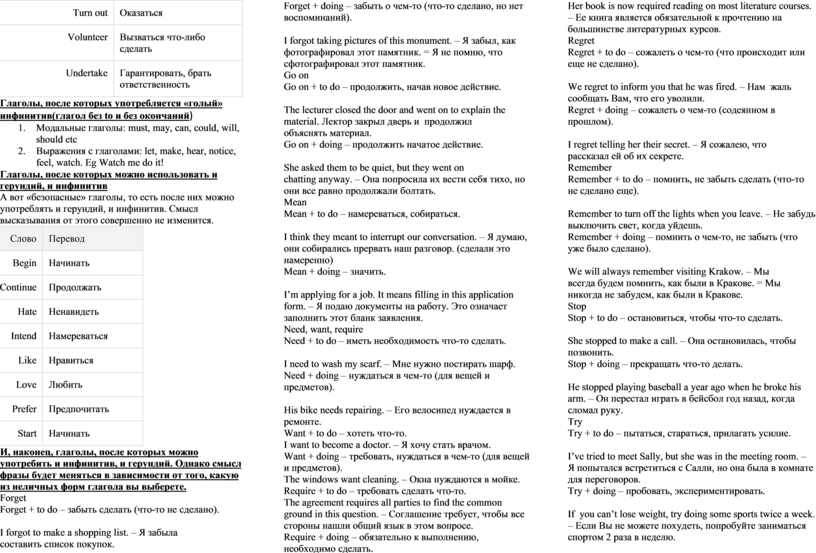 И, наконец, глаголы, после которых можно употребить и инфинитив, и герундий. Однако смысл фразы будет меняться в зависимости от того, какую из неличных форм глагола вы выберете.