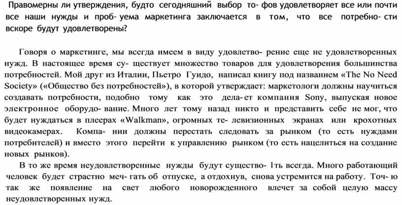 Правомерны ли утверждения, будто сегодняшний выбор то- фов удовлетворяет все или почти все наши нужды и проб уема маркетинга заключается в том, что все потребно сти вскоре будут удовлетворены?