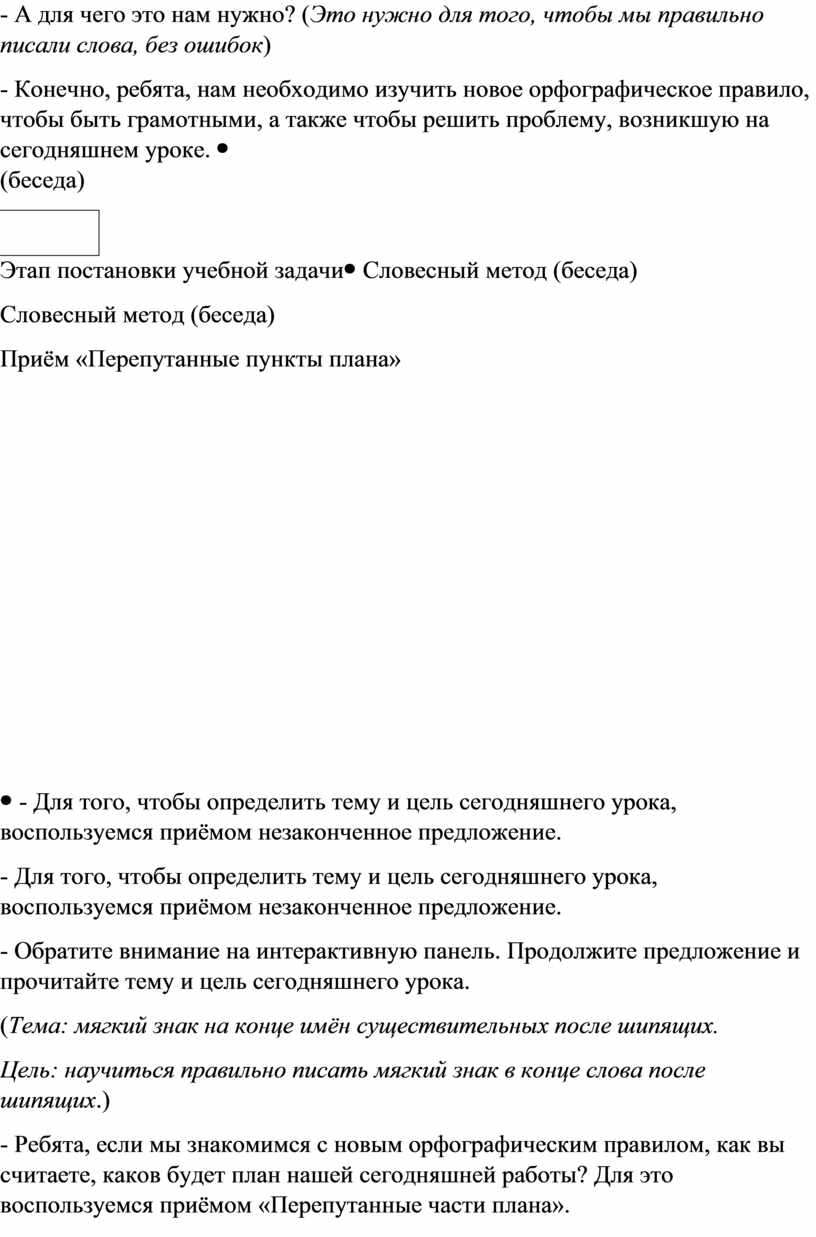 - Для того, чтобы определить тему и цель сегодняшнего урока, воспользуемся приёмом незаконченное предложение. - Обратите внимание на интерактивную панель. Продолжите предложение и прочитайте тему и цель сегодняшнего урока. (Тема: мягкий знак на конце имён существительных после шипящих. Цель: научиться правильно писать мягкий знак в конце слова после шипящих.) - Ребята, если мы знакомимся с новым орфографическим правилом, как вы считаете, каков будет план нашей сегодняшней работы? Для это воспользуемся приёмом «Перепутанные части плана». - У вас на партах лежат карточки с пунктами плана, но они перепутаны. Ваша задача – расположить их в правильном порядке, работая в парах. Вспомните, какие правила работы в парах вы знаете? - Отлично, я надеюсь, что вы будете соблюдать данные правила. - (Имя), разложи пункты плана в правильном порядке на доске, при помощи магнитов. Проверим. Все ли согласны? - Спасибо! - А сейчас самое время отправиться в удивительное путешествие по миру русского языка и познакомиться с новым орфографическим правилом. |