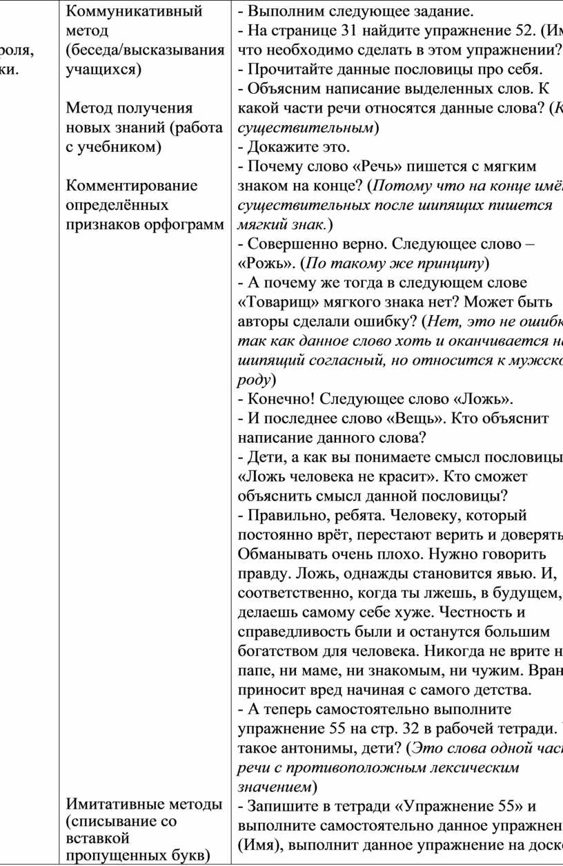 - Выполним следующее задание. - На странице 31 найдите упражнение 52. (Имя), что необходимо сделать в этом упражнении? - Прочитайте данные пословицы про себя. - Объясним написание выделенных слов. К какой части речи относятся данные слова? (К существительным) - Докажите это. - Почему слово «Речь» пишется с мягким знаком на конце? (Потому что на конце имён существительных после шипящих пишется мягкий знак.) - Совершенно верно. Следующее слово – «Рожь». (По такому же принципу) - А почему же тогда в следующем слове «Товарищ» мягкого знака нет? Может быть авторы сделали ошибку? (Нет, это не ошибка, так как данное слово хоть и оканчивается на шипящий согласный, но относится к мужскому роду) - Конечно! Следующее слово «Ложь». - И последнее слово «Вещь». Кто объяснит написание данного слова? - Дети, а как вы понимаете смысл пословицы «Ложь человека не красит». Кто сможет объяснить смысл данной пословицы? - Правильно, ребята. Человеку, который постоянно врёт, перестают верить и доверять. Обманывать очень плохо. Нужно говорить правду. Ложь, однажды становится явью. И, соответственно, когда ты лжешь, в будущем, делаешь самому себе хуже. Честность и справедливость были и останутся большим богатством для человека. Никогда не врите ни папе, ни маме, ни знакомым, ни чужим. Враньё приносит вред начиная с самого детства. - А теперь самостоятельно выполните упражнение 55 на стр. 32 в рабочей тетради. Что такое антонимы, дети? (Это слова одной части речи с противоположным лексическим значением) - Запишите в тетради «Упражнение 55» и выполните самостоятельно данное упражнение. (Имя), выполнит данное упражнение на доске. - А теперь обменяйтесь тетрадями. Сверьтесь с эталоном, который представлен на интерактивной доске, и проверьте правильность выполнения работы соседа. (День – ночь, правда – ложь, старт – финиш, смех – плач, шум – тишь, полдень – полночь) - Если работа выполнена полностью верно – поставьте 5; если работа выполнена с одной ошибкой – поставьте 4; с двумя ошибками – 3. Если более двух ошибок – поставьте неудовлетворительную оценку. - В конце урока я соберу тетради и выставлю оценки в журнал. - А теперь поднимите руки те, кто считает, что он хорошо изучил сегодняшнее орфографическое правило. Вы большие молодцы, Дети! |