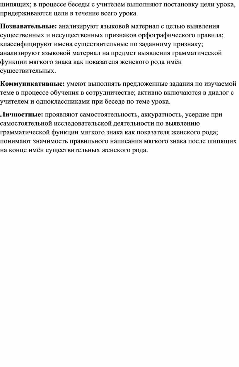 Личностные: проявляют самостоятельность, аккуратность, усердие при самостоятельной исследовательской деятельности по выявлению грамматической функции мягкого знака как показателя женского рода; понимают значимость правильного написания мягкого знака после шипящих на конце имён существительных женского рода.
