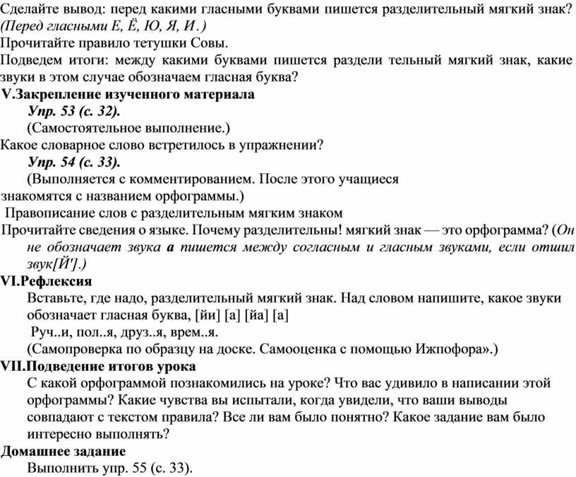 Сделайте вывод: когда в словах пишется разделительныII мягкий знак? (Если после согласного звука слышим звук [Й'„ а потом идет гласная буква, то пишется разделительным мягкий знак.)