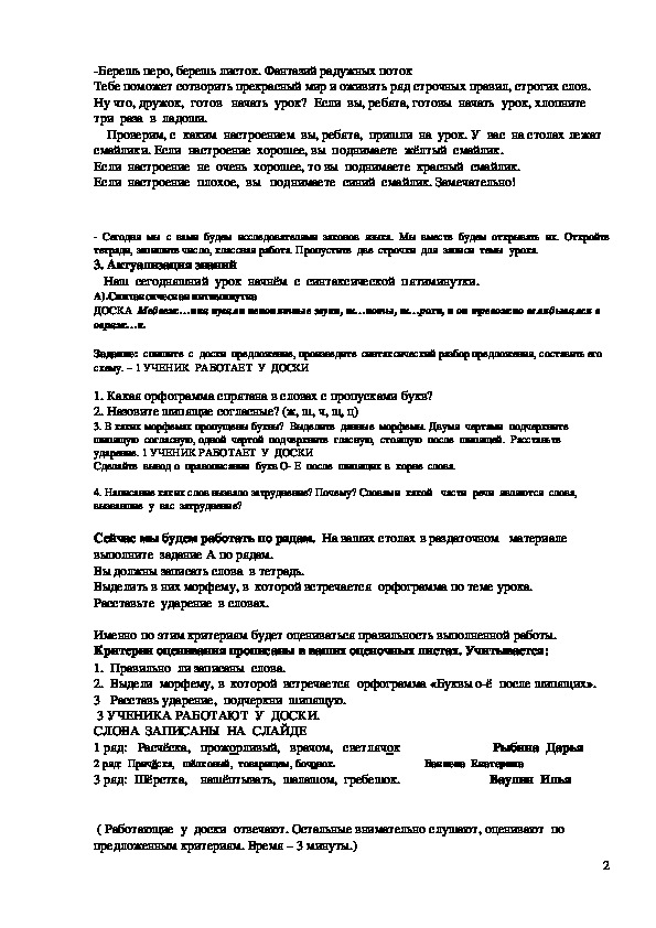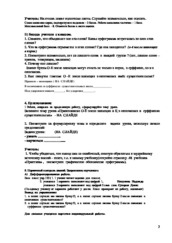 «Правописание гласных О – Е после шипящих в окончаниях и суффиксах существительных» и применению их в нестандартных учебных ситуациях.