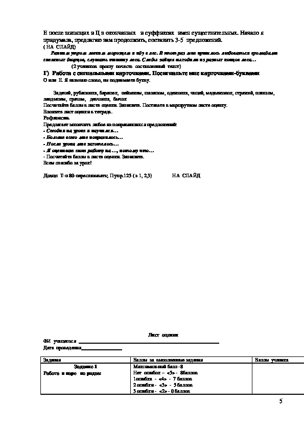 Посчитайте баллы в листе оценки. Запишите. Поставьте в маршрутном листе оценку.
