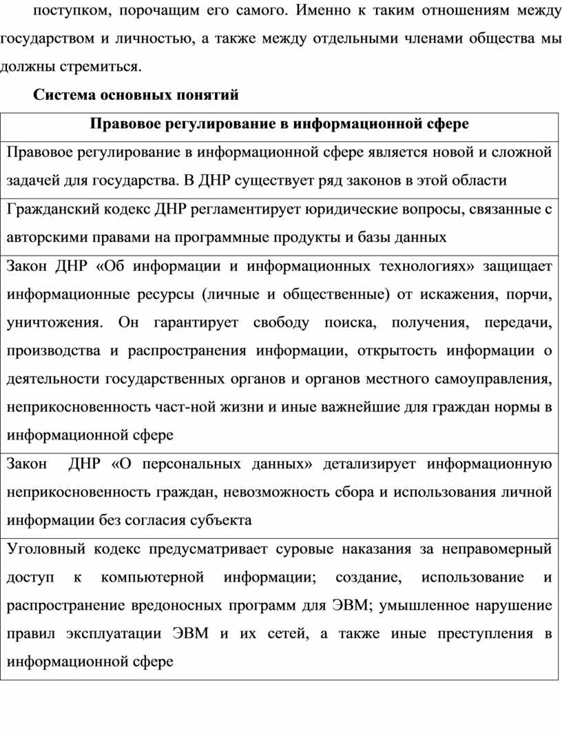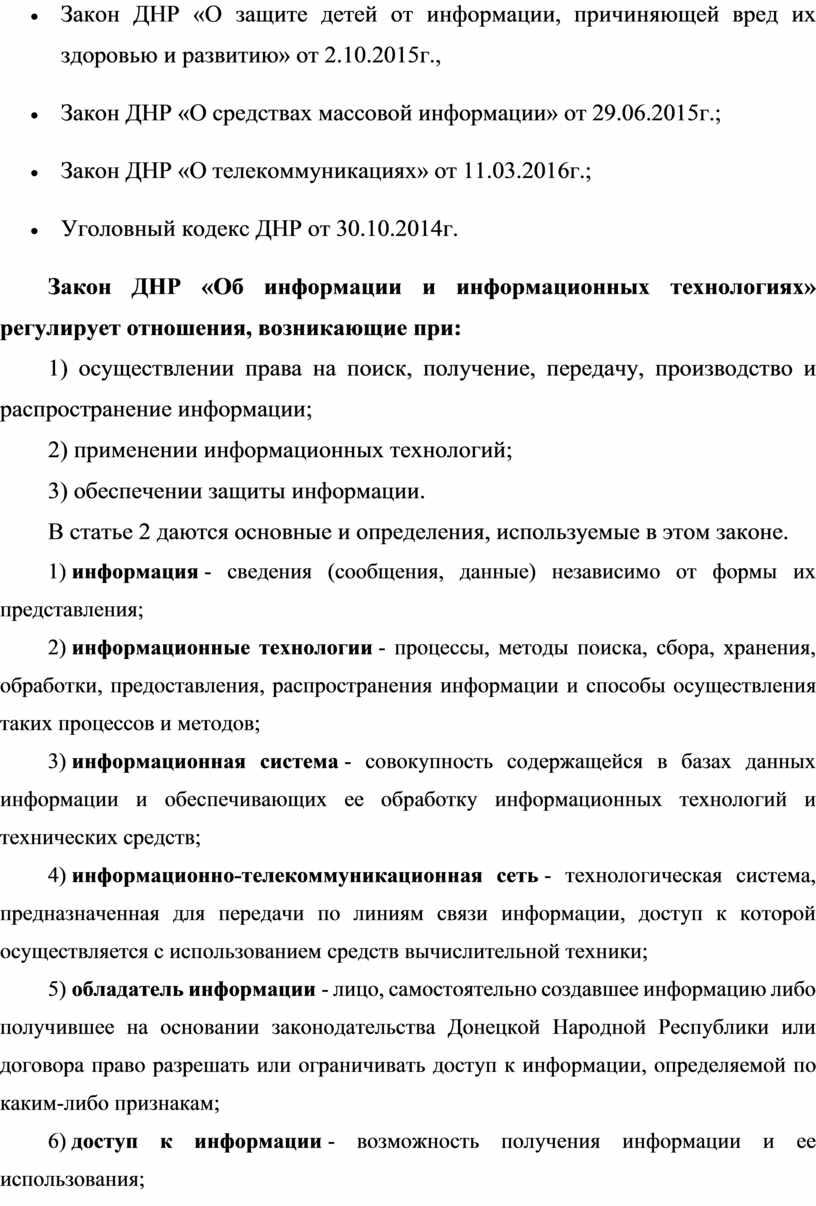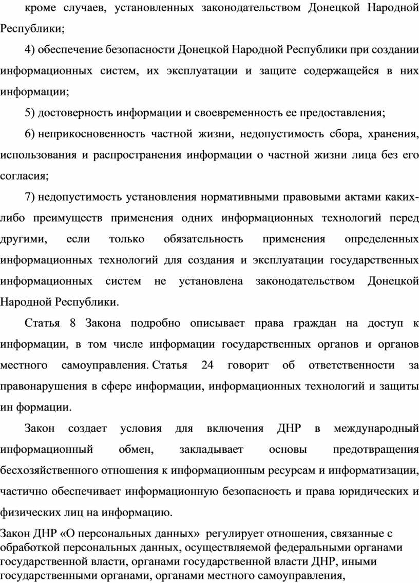 Закон ДНР «Об информации и информационных технологиях» защищает информационные ресурсы (личные и общественные) от искажения, порчи, уничтожения. Он гарантирует свободу поиска, получения, передачи, производства и распространения информации, открытость информации о деятельности государственных органов и органов местного самоуправления, неприкосновенность част-ной жизни и иные важнейшие для граждан нормы в информационной сфере |