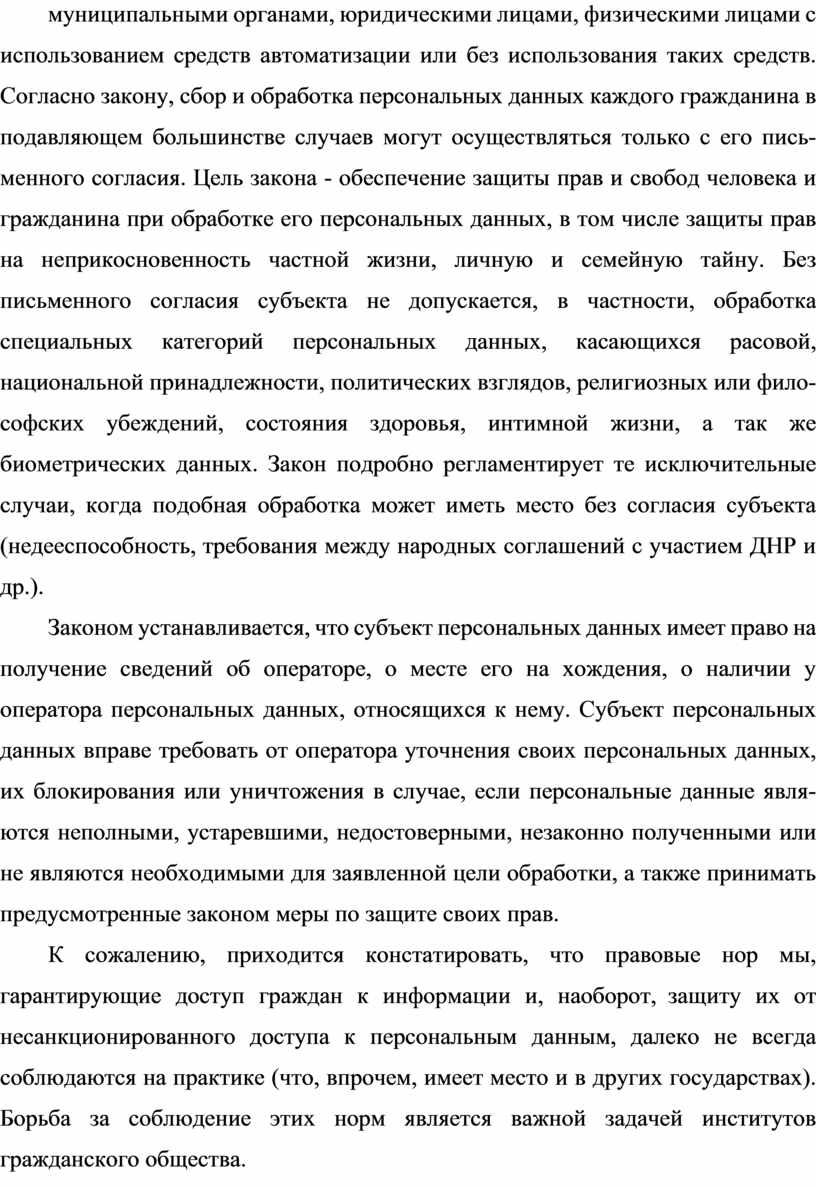 Закон ДНР «О персональных данных» регулирует отношения, связанные с обработкой персональных данных, осуществляемой федеральными органами государственной власти, органами государственной власти ДНР, иными государственными органами, органами местного самоуправления, муниципальными органами, юридическими лицами, физическими лицами с использованием средств автоматизации или без использования таких средств. Согласно закону, сбор и обработка персональных данных каждого гражданина в подавляющем большинстве случаев могут осуществляться только с его письменного согласия. Цель закона - обеспечение защиты прав и свобод человека и гражданина при обработке его персональных данных, в том числе защиты прав на неприкосновенность частной жизни, личную и семейную тайну. Без письменного согласия субъекта не допускается, в частности, обработка специальных категорий персональных данных, касающихся расовой, национальной принадлежности, политических взглядов, религиозных или философских убеждений, состояния здоровья, интимной жизни, а так же биометрических данных. Закон подробно регламентирует те исключительные случаи, когда подобная обработка может иметь место без согласия субъекта (недееспособность, требования между народных соглашений с участием ДНР и др.).
